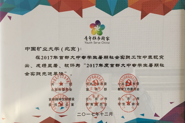 日前,共青团北京市委、北京市委宣传部、北京市学联等六家单位联合表彰了2017年首都大中专学生暑期社会实践工作中表现突出、成绩显著的优秀集体,我校被评为“2017年度首都大中专学生暑期社会实践先进单位”。