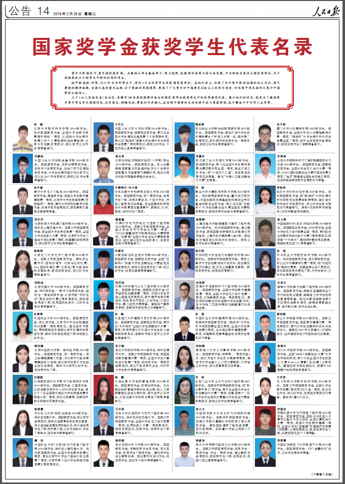 国家奖学金是为了激励普通本科高校、高等职业学校和高等专科学校学生勤奋学习、努力进取,在德、智、体、美等方面全面发展,由中央政府出资设立的奖励特别优秀学生的奖学金。多年来,我校本着公开、公平、公正、择优的原则,严格按照国家政策认真组织开展国家奖学金评审工作。经过严格选拔、评审,2017年全国本专科学生中,约5万名优秀大学生荣获国家奖学金,此次《人民日报》共展示了100位获奖学生代表的风采,旨在激励更多的青年学子奋发图强、回报母校、感恩社会