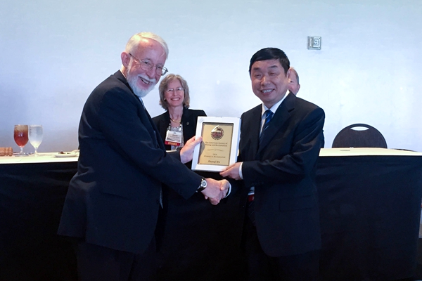 在6月4日中午的颁奖典礼上,我校胡振琪教授荣获矿山复垦(修复)领域国际大奖--复垦(修复)先锋奖(Pioneer in Reclamation),这是中国土地复垦与生态修复学者在世界范围内首次获得该奖项,表明中国土地复垦与生态修复学者的学术影响力已获得国际复垦与修复界的高度认可。ASMR奖励委员会主席Shuman博士宣读颁奖决定和颁奖词,介绍了胡振琪28年来在采煤沉陷地复垦、煤矸石山生态修复等矿山修复领域取得的成绩及国际影响。现任主席KimeryVories先生为胡振琪教授颁奖。胡振琪此次获奖,得到了美国、加拿大和希腊5位专家的提名推荐和支持,并通过学会奖励委员会评审。