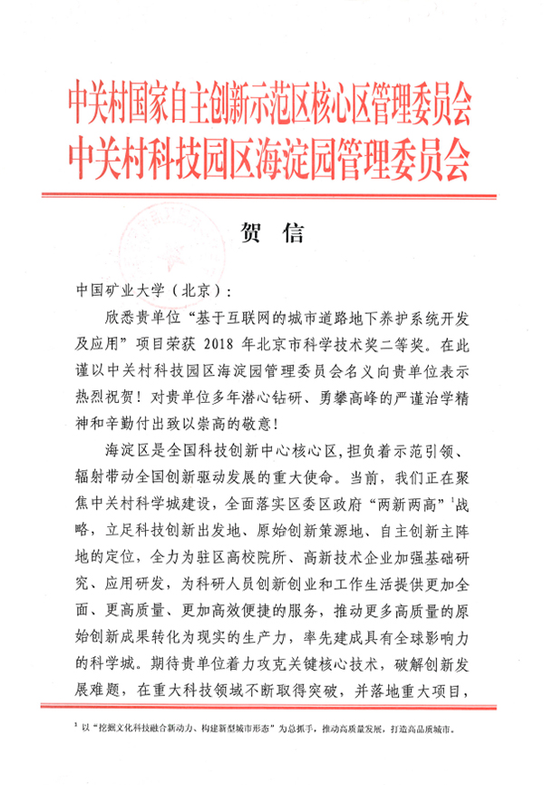 本网讯 3月1日,中关村科技园区海淀园管理委员会发来贺信,祝贺我校彭苏萍院士团队完成的科技成果“基于互联网的城市道路地下养护系统开发及应用”获得2018年度北京市科学技术奖二等奖(获奖编号:2018城-2-005)。贺信中强调海淀区是全国科技创新中心核心区,担负着示范引领、辐射带动全国创新驱动发展的重大使命。管委会正聚焦中关村科学城建设,全面落实区委区政府“两新两高”战略,全力为驻区高校和科研人员提供更加全面、更高质量、更加高效便捷的服务,率先建成具有全球影响力的科学城,同时也期待着我校在重大科技领域取得更大突破。