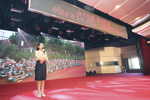 在中华人民共和国成立70周年庆祝大会上,我校450名师生作为“美好生活”游行方阵的一部分走过天安门,我校理学院辅导员李姗姗作为教师代表,登上了“美好生活”游行方阵的彩车。李姗姗以《奋斗的生活最幸福》为题,讲述了我校师生为了在短短两分钟、96米的距离里走出矿大人的青春风采而刻苦训练的动人故事。