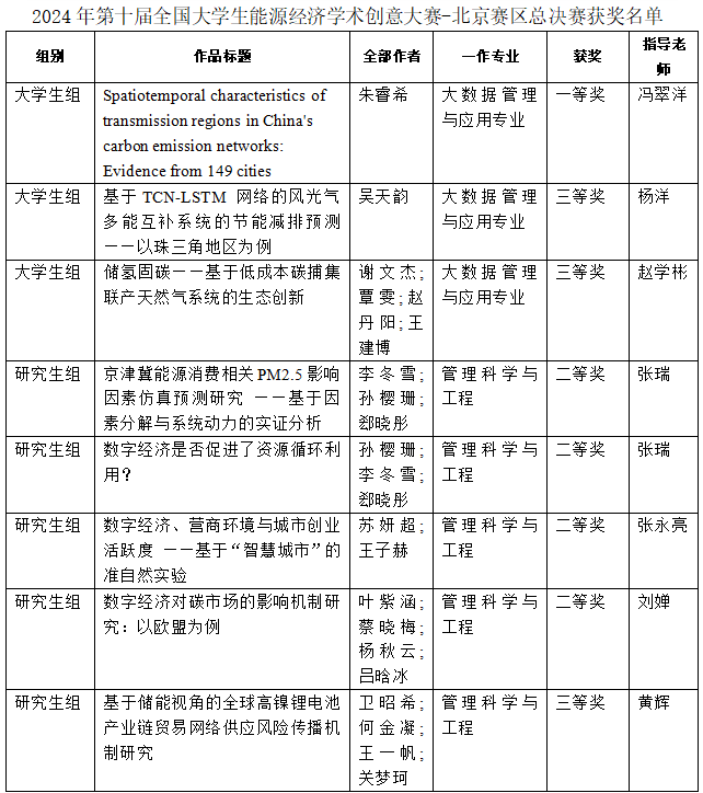 本网讯 4月13日,第十届全国大学生能源经济学术创意大赛北京赛区总决赛在北京航空航天大学落下帷幕。来自北京赛区的21所高校参赛选手出席。经过现场答辩,管理学院共8份作品获奖,其中冯翠洋老师指导的大学生组《Spatiotemporal characteristics of transmission regions in China's carbon emission networks: Evidence from 149 cities》作品获一等奖并晋级全国总决赛。其他作品获研究生组二等奖4项,三等奖1项,本科生组三等奖2项。