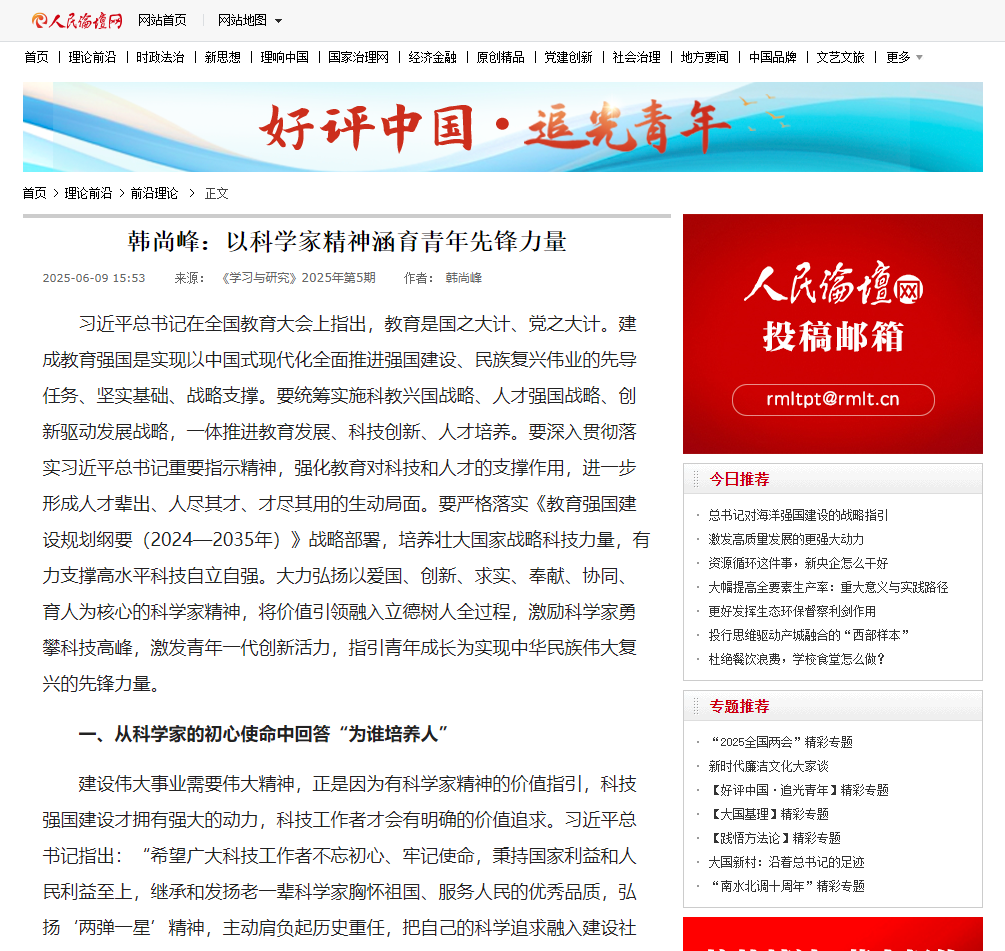 校党委书记韩尚峰在由中共中央政策研究室主办的《学习与研究》杂志2025年第5期上发表署名文章《以科学家精神涵育青年先锋力量》,《学习与研究》文章目录被《人民日报》刊登,文章被《人民论坛网》全文转载,请看报道——