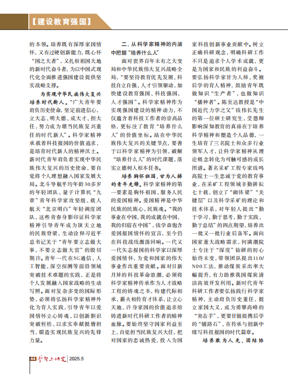 培养胸怀祖国、甘为人梯的青年先锋。科学家精神的第一要素是胸怀祖国、服务人民的爱国精神。爱国精神是中华民族的民族心、民族魂。“我的事业在中国,我的成就在中国,我的归宿在中国”,钱学森饱含爱国报国情怀的宣言,至今仍在科技战线激荡回响。一代又一代矢志报国的科学家以深厚爱国情怀,为党和国家的伟大事业作出重要贡献。面对日新月异的科技革命浪潮,必须将科学家精神传承作为人才战略工程的铸魂之本,构建代际相承、薪火相传育才体系,让立心天地、许身家国的价值追求熔铸进新时代科研工作者的精神血脉。要始终坚守国家利益至上,自觉担当民族复兴大任,把对国家的忠诚热爱,投入为国家科技创新事业贡献中。树立正确科研观念,明确科研工作不只是追求个人学术成就,更是为国家和民族的利益奋斗。要弘扬科学家甘为人梯、奖掖后学的育人精神,鼓励青年既做知识“生产者”,也做知识“播种者”。陈至达教授是“中国近代力学之父”钱伟长先生的第一位硕士研究生,受恩师影响深知教育的真谛在于培养科学精神和塑造个人品德,一生培育了三名院士和众多行业领军人才,让科学家精神从理论概念转化为可触可感的成长图谱。著名采矿工程专家钱鸣高院士一生忠诚于党的教育事业,在采矿工程领域辛勤耕耘七十载,创立了“砌体梁”“关键层”以及科学采矿的理论和技术体系,对年轻人提出“勤于学习、勤于思考、勤于实践、勤于总结”的四点期望,培养出一批又一批行业后备军。面向国家重大战略需求,何满潮院士专注于“深度”钻研的初心始终未变,带领团队提出110/N00工法,推动煤炭采出率大幅提升,有力助推我国煤炭清洁高效开发利用。新时代青年科研工作者要弘扬践行科学家精神,主动肩负历史重任,挺立家国大义,成为勇攀高峰的“突击手”,更要甘做提携后学的“铺路石”,在传承与创新中续写科技报国的时代篇章。