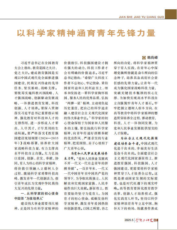 校党委书记韩尚峰在《学习与研究》杂志上发表署名文章《以科学家精神涵育青年先锋力量》