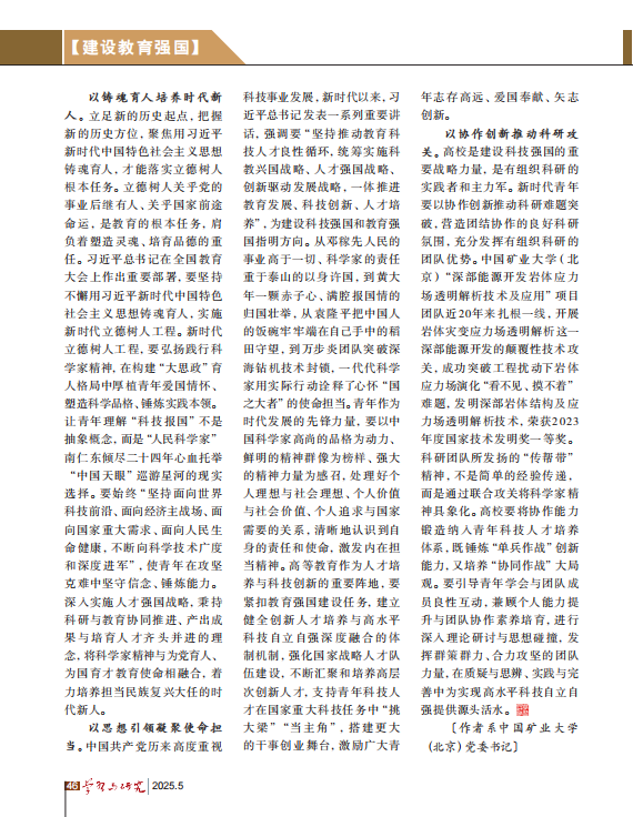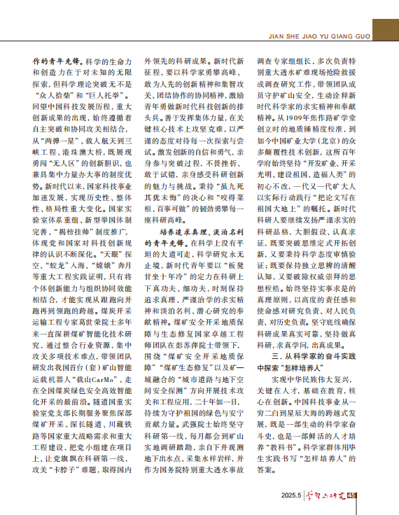 培养追求真理、淡泊名利的青年先锋。在科学上没有平坦的大道可走,科学研究永无止境,新时代青年要以“板凳甘坐十年冷”的定力在科研上下真功夫、细功夫,时刻保持追求真理、严谨治学的求实精神和淡泊名利、潜心研究的奉献精神。煤矿安全开采地质保障与生态修复国家卓越工程师团队在彭苏萍院士带领下,围绕“煤矿安全开采地质保障”“煤矿生态修复”以及矿—城融合的“城市道路与地下空间安全探测”方向开展技术攻关和工程应用,二十年如一日,持续为守护祖国的绿色与安宁贡献力量。武强院士始终坚守科研第一线,每月都会到矿山实地调研踏勘,亲自下井观测地下出水点、采集水样岩样,并作为国务院特别重大透水事故调查专家组组长,多次负责特别重大透水矿难现场抢险救援或调查研究工作,带领团队成员守护矿山安全,生动诠释新时代科学家的求实精神和奉献精神。从1909年焦作路矿学堂创立时的地质锤精度校准,到如今中国矿业大学(北京)的众多颠覆性技术创新,这所百年学府始终坚持“开发矿业、开采光明、建设祖国、造福人类”的初心不改,一代又一代矿大人以实际行动践行“把论文写在祖国大地上”的嘱托。新时代科研人要继续发扬严谨求实的科研品格,大胆假设、认真求证,既要突破思维定式开拓创新,又要秉持科学态度审慎验证;既要保持独立思辨的清醒认知,又要破除权威崇拜的思想桎梏。始终坚持实事求是的真理原则,以高度的责任感和使命感对研究负责、对人民负责、对历史负责。坚守底线确保科研成果真实可靠,坚持做真科研,求真学问,出真成果。