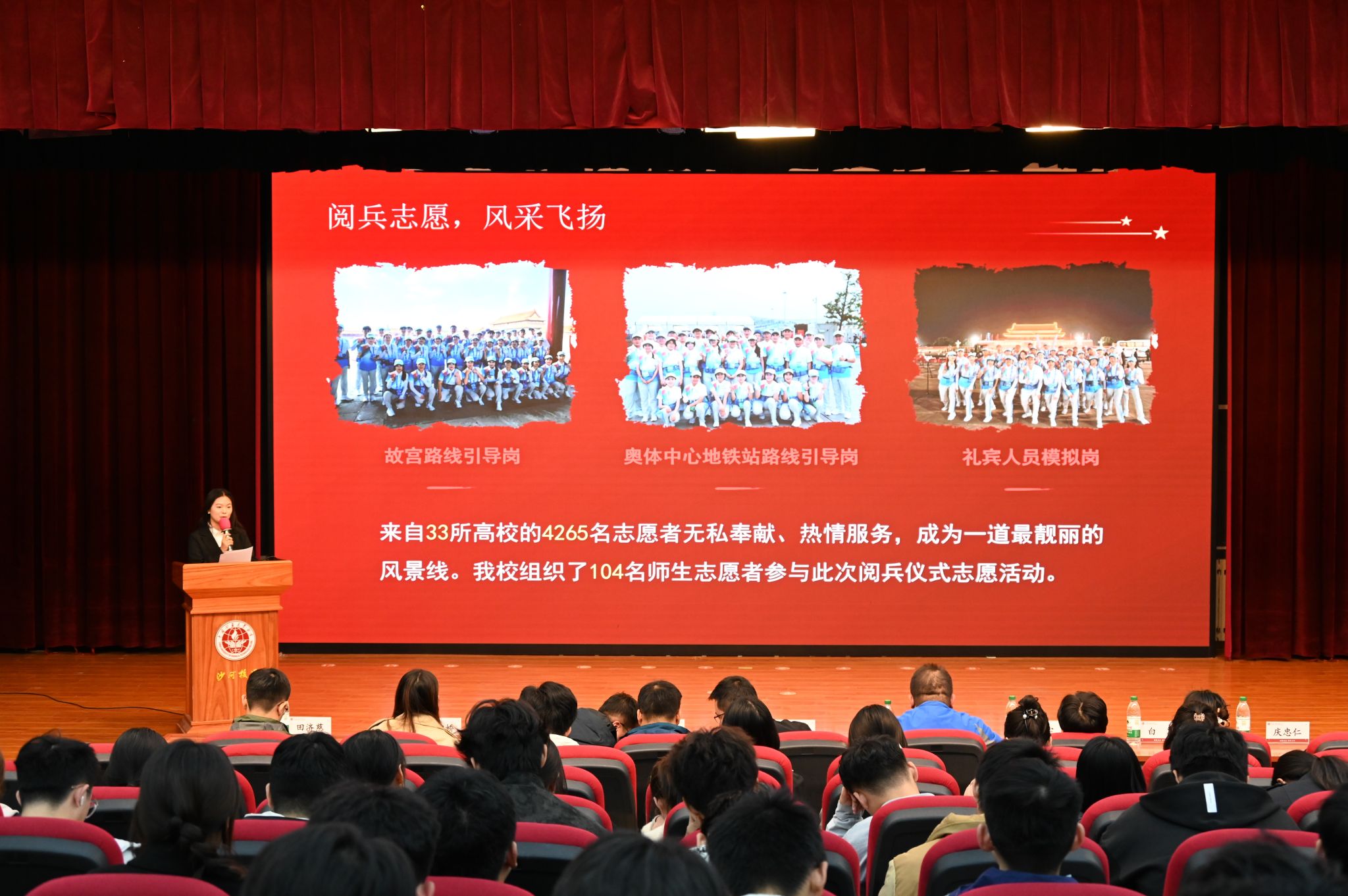 随后,学校参与纪念中国人民抗日战争暨世界反法西斯战争胜利80周年大会服务保障工作的两组志愿者代表,深情讲述了不为人知的奉献故事。他们回顾了校内外专项培训、多轮模拟演练的奉献经历,介绍了不同岗位的工作内容与职责,分享了在躬身实践中收获的成长与深刻感悟。他们感到,志愿服务是一堂生动而深刻的“大思政课”,青年学子应当胸怀报国之志、厚植家国情怀,主动担当时代责任,助力民族复兴。他们表示,同学们应当珍惜在京学习机遇,积极融入首都发展大局,立足首都、放眼世界。