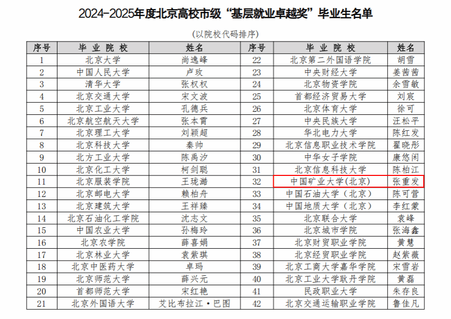 本网讯 近日,2024-2025年度北京高校市级“基层就业卓越奖”评选结果揭晓,能源与矿业学院2018届本科毕业生张重发凭借在基层岗位上的突出表现与卓越贡献,荣获此项荣誉,成为全校学子扎根基层、建功立业的优秀典范。