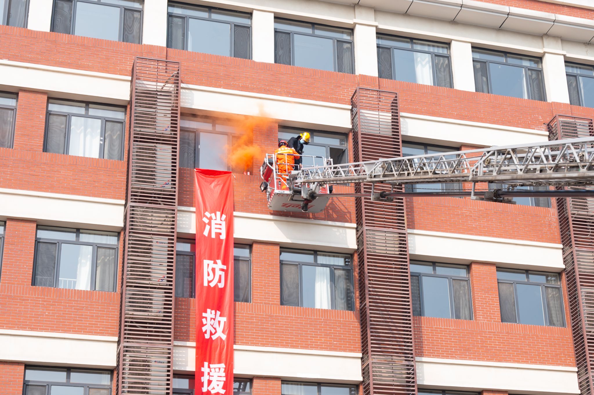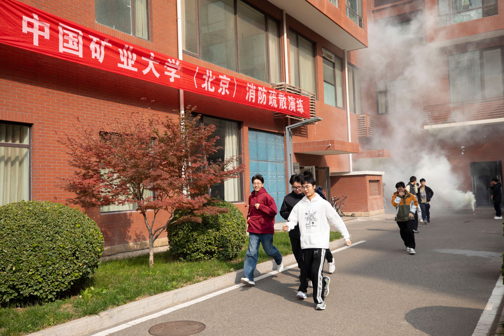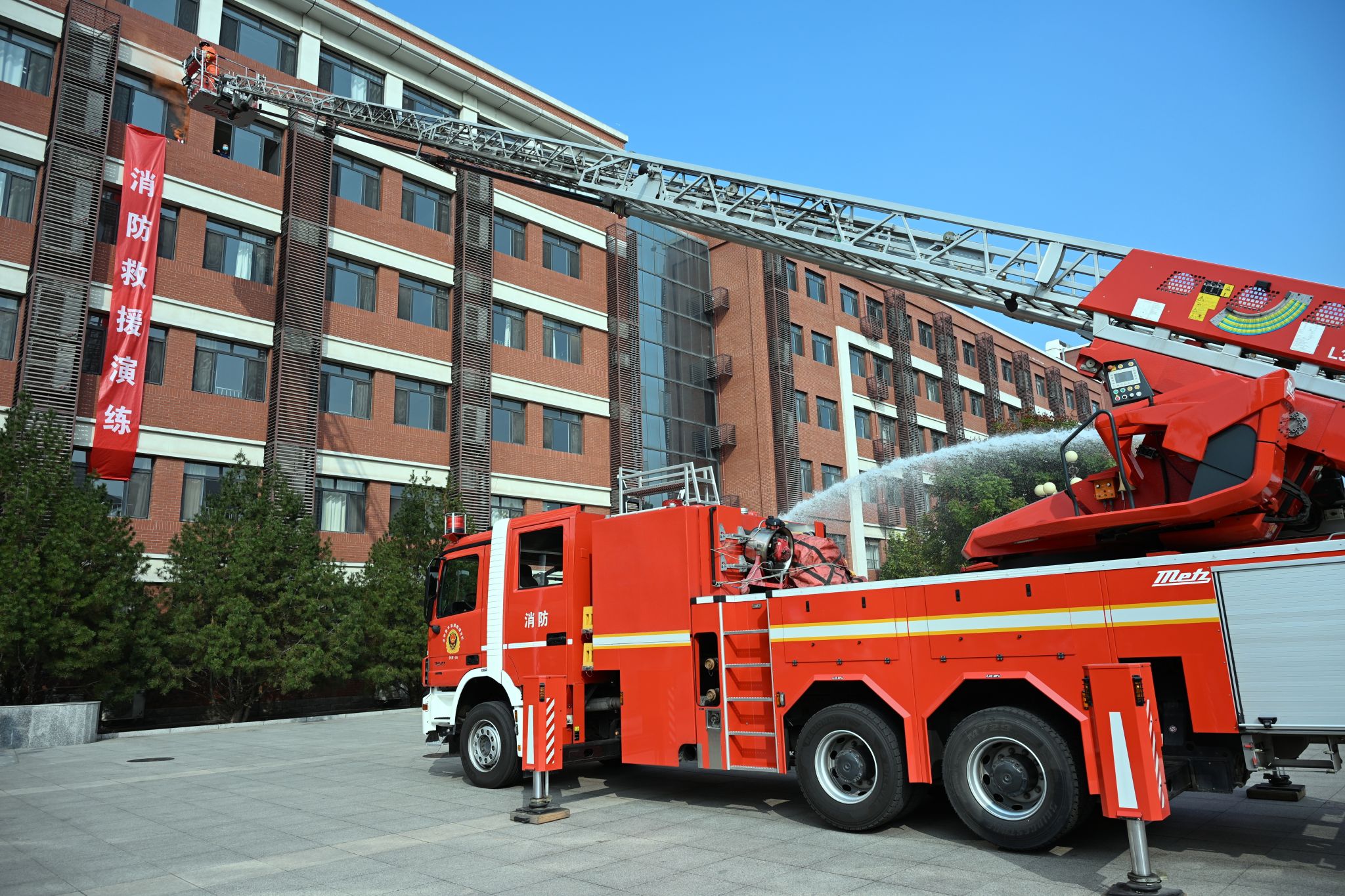 中午12:20,各公寓楼新生在宿舍集合待命。12:30,全体演练工作人员、保安及平安校园志愿者抵达指定岗位,开启所有疏散通道并停用电梯。12:40,总指挥一声令下,“火灾警报”响彻校园,各公寓楼从高层至低层逐层启动消防广播,放烟组在楼道及楼门口放置烟雾弹模拟真实火情。2025级新生在保安员和平安校园志愿者服务队队员的指引下掩住口鼻低姿快速有序撤离“火场”,疏散至南广场和运动场,整个过程紧张有序,用时12分08秒,达到了演练预案预期效果。在场师生还观摩了沙河消防救援站云梯救援、水炮灭火、伤员救助等演练项目。