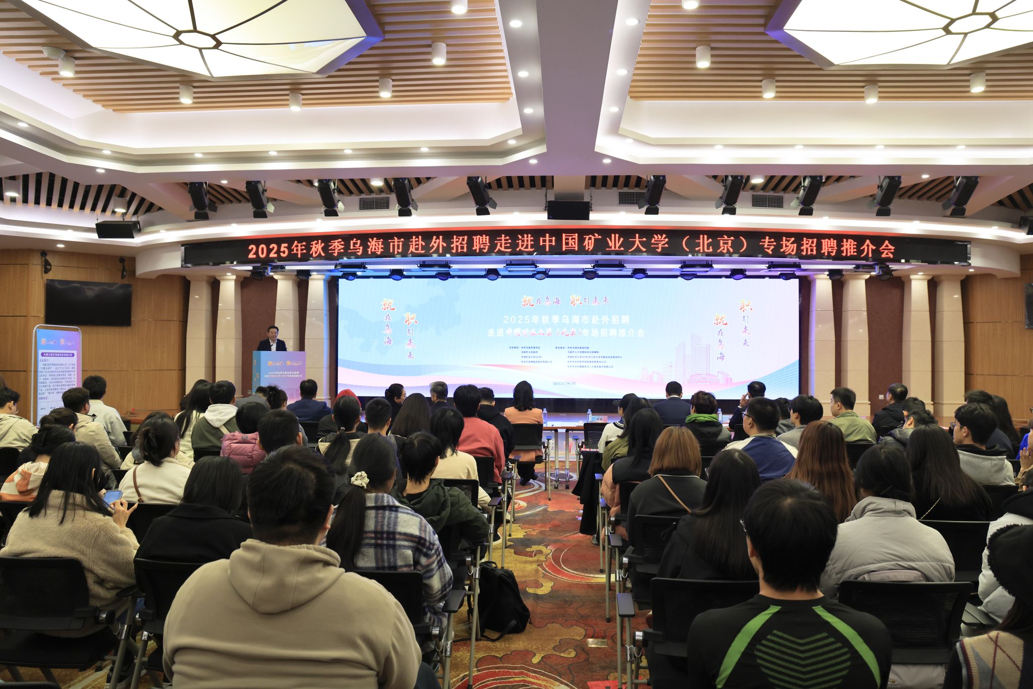 本网讯 10月30日下午,在学校福中苑报告厅举办了“就在乌海 职引未来”——2025年秋季乌海市赴外招聘走进中国矿业大学(北京)专场招聘推介会。校长刘波、乌海市人民政府副市长张明明、中关村发展集团副总经理张金辉出席会议,乌海市人力资源和社会保障局局长薛峰、北京中关村智酷双创人才服务股份有限公司董事长赵强,学校学生工作处负责人、就业指导中心工作人员、近20家乌海市重点企事业单位招聘负责人和500余名毕业生参加会议。
