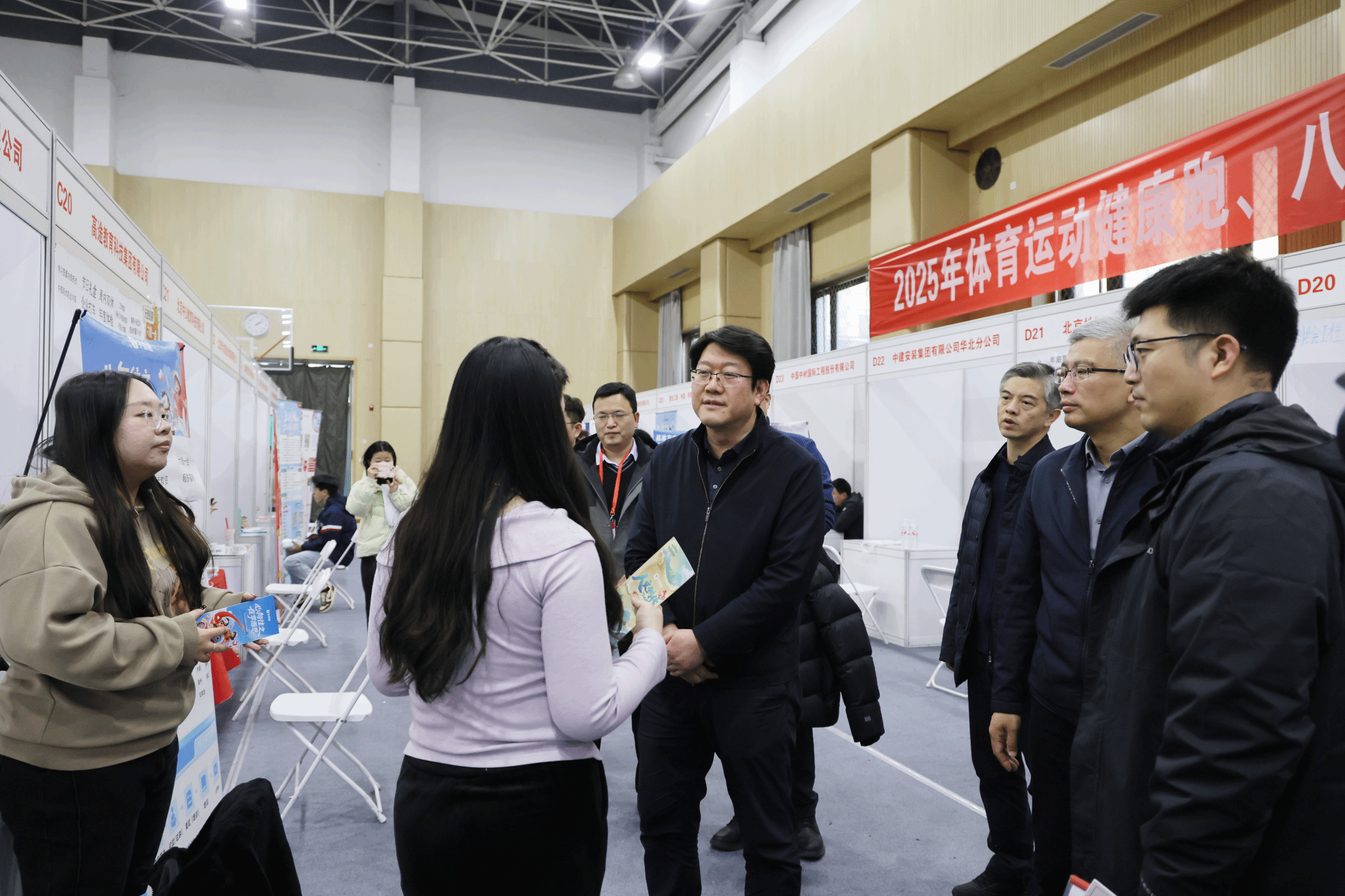 本网讯 11月21日下午,学校与北京高校大学生就业创业指导中心在体育训练馆联合举办了“京彩就业”2026届毕业生秋季第三场就业双选会。校党委书记韩尚峰、校党委副书记安宇出席活动并现场调研指导,并与多家用人单位代表和求职毕业生深入交流。