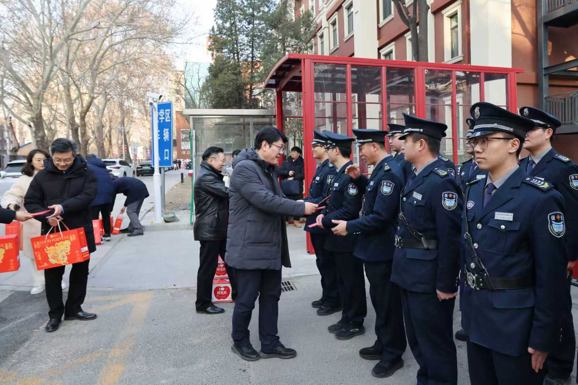 校领导一行先后来到学院路校区教学区出入口、教学楼、图书馆、体育训练馆、学生食堂、学生公寓和校医院等,慰问春节、寒假期间坚守岗位的服务保障一线员工、医护人员、在岗值班人员代表,并送上新春祝福。