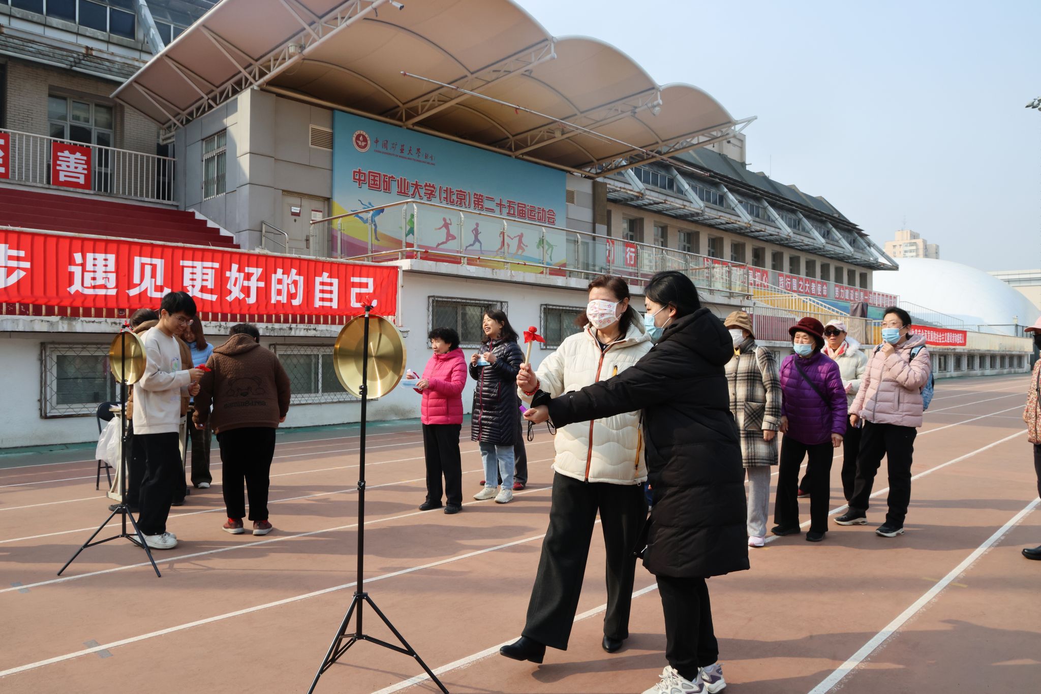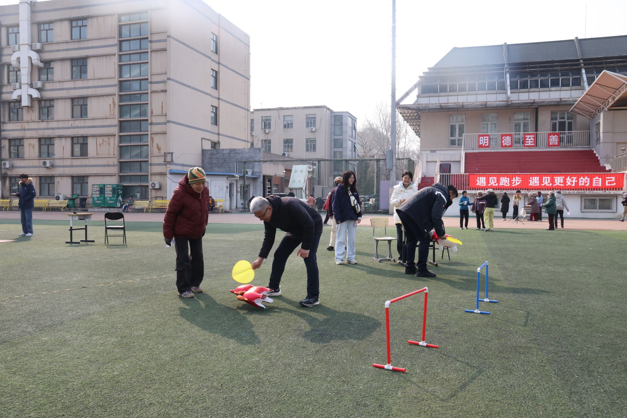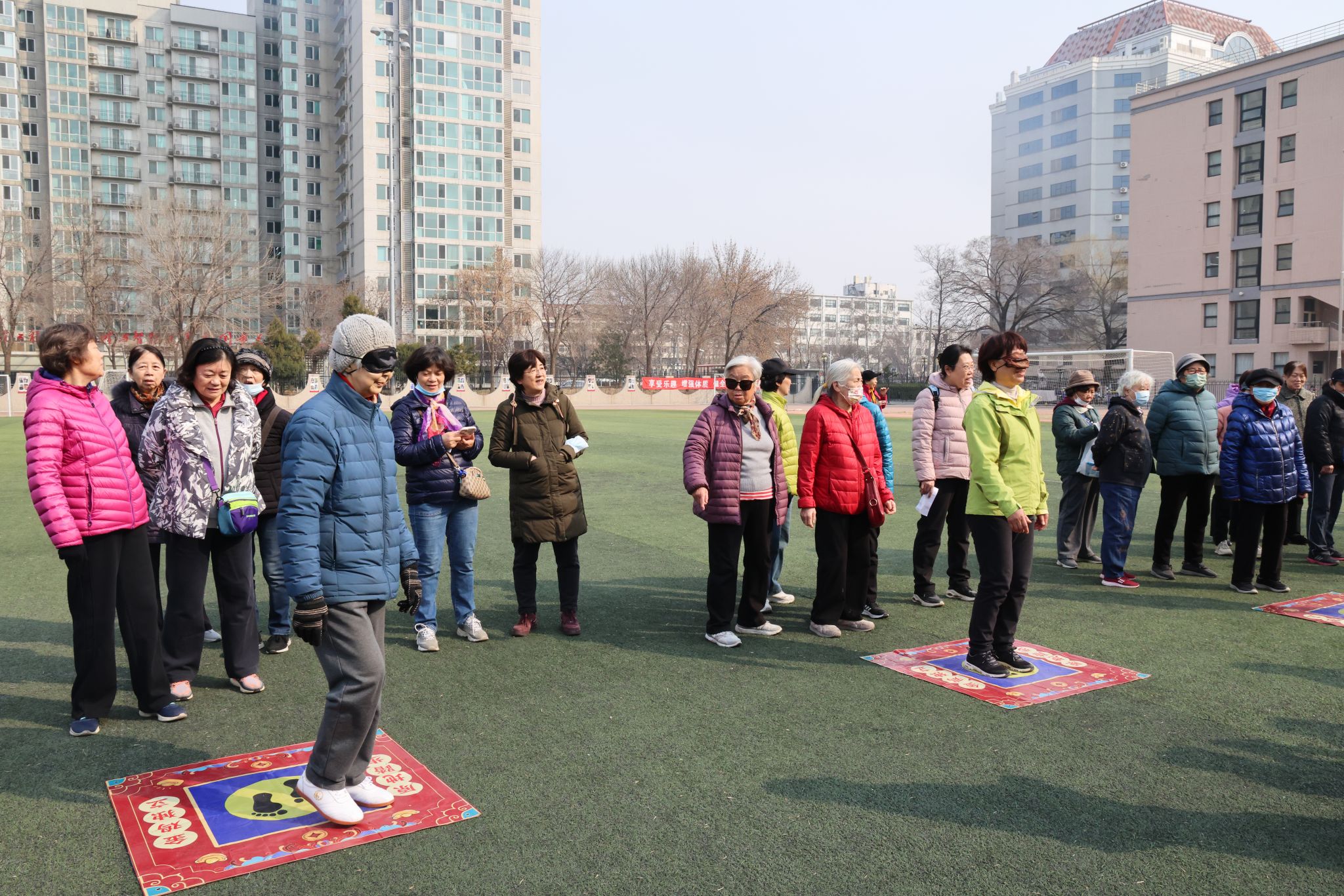 本次活动首先进行了健步行环节,老同志们精神饱满,步履稳健,沿着操场跑道畅享春日暖阳。随后,现场设置了“不倒森林”“蒙眼原地踏步”“蒙眼敲锣”“赶马如笼”四项趣味健身项目。这些项目充满童趣与挑战,引得大家跃跃欲试,现场欢声笑语不断,老同志们兴致勃勃,互相鼓励,每一个角落都洋溢着节日的喜悦。