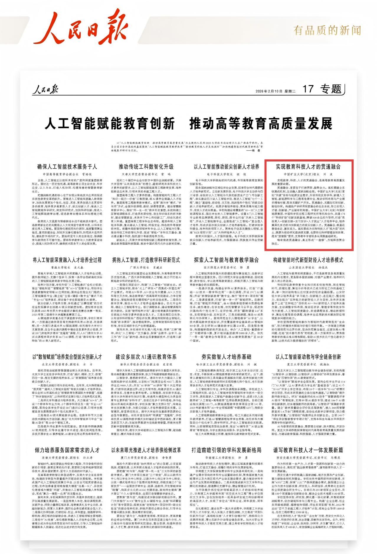 中国矿业大学(北京)校长刘波围绕“实现教育科技人才的贯通融合”作交流发言