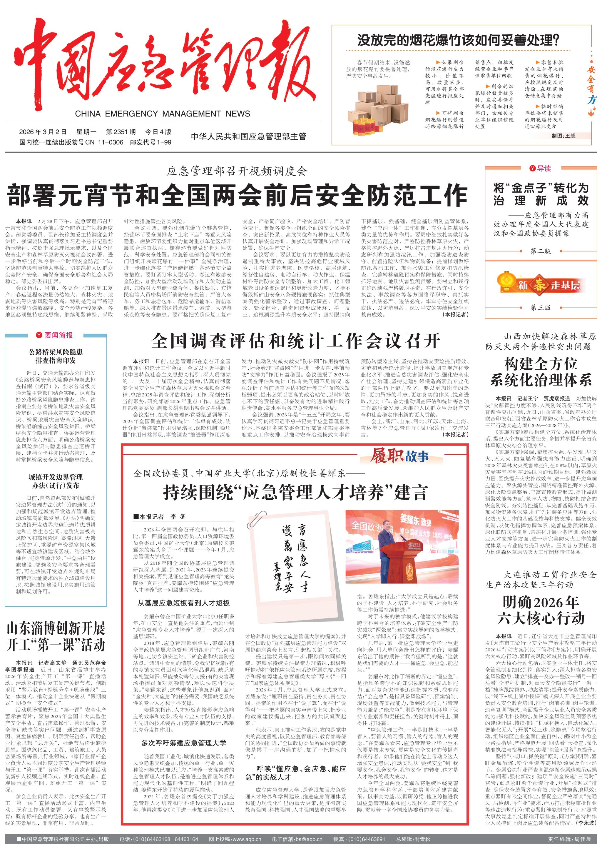 今年全国两会,姜耀东将继续围绕完善应急管理学科体系、干部培训体系建言献策。以事实为基,以调研为凭,他正为推进我国应急管理体系和能力现代化、筑牢安全屏障,贡献着一名全国政协委员的务实力量。
