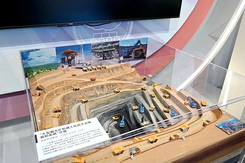 展出成果以国家能源集团准能黑岱沟露天煤矿实际生产场景为蓝本,场景模型1000mm×1000mm×300mm。通过精准复刻的无人驾驶矿卡、电铲模型,以及错落布局与流畅作业演示,生动还原了露天煤矿采装、运输、排弃全流程无人化运作场景,让观众直观感受传统能源行业智能化形态。