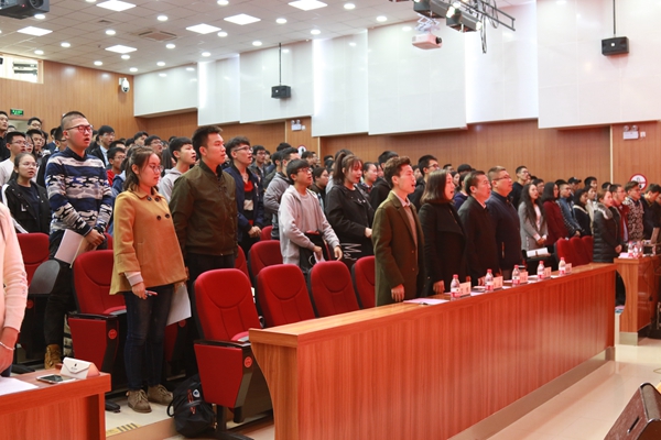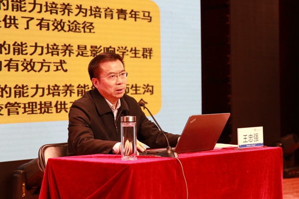 开班仪式结束后,王忠强以“深入学习贯彻党的十九大精神·关于团学工作和团学干部的全面成长成才”为题作了团校第一讲报告。王忠强在报告中深刻阐述了学习宣传贯彻党的十九大精神的重大意义,要求学生干部们认认真真、原原本本地研读十九大报告、新修订的党章和团委下发的《习近平关于青少年和共青团工作论述摘编》,着力在掌握精神实质上下功夫、在学深学透上下功夫、在融会贯通上下功夫,完整准确地领会十九大精神。王忠强还谈到了三个方面,一是明确学校各级团学组织的职能和工作任务,学生干部是联系学校和同学之间的桥梁,作为学生干部,要认清自己的定位,坚定信念;二是学生干部要讲工作方法和原则,要坚持在团委的指导下工作,要在同学中赢得信任和支持,为同学服务;三是学生干部要全面成长成才,一定要培养自身素质和能力,树立终生学习的目标,培养认真良好的学习习惯,并以亲身经历鼓励我们要认真学习,摒弃诱惑。王忠强提出“学为才本,能为工源”,希望团学干部秉承“严谨治学、开拓创新”的校训,发扬艰苦奋斗的创业精神和迎难而上的拼搏精神,好学力行,奋发图强,为学校建设和祖国发展做出新的贡献。