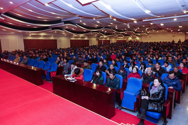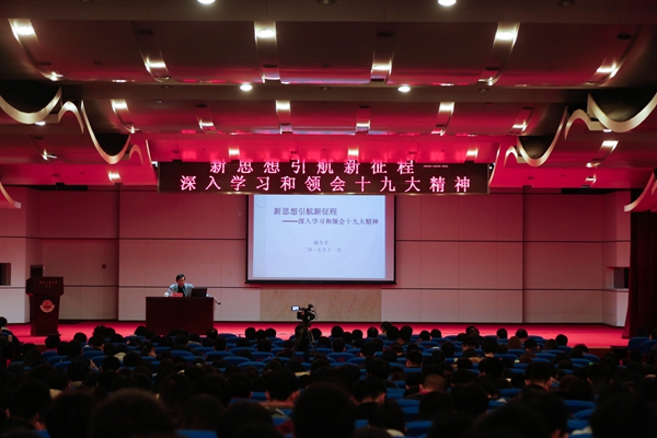 本网讯 11月16日下午,学校党委在科技会堂四层报告厅举办党的十九大精神宣讲会,邀请首都师范大学博士生导师杨生平作题为《新思想引航新征程——深入学习和领会十九大精神》的报告。校党委副书记王忠强,副校长朱书全,校党委副书记、纪委书记董晞与师生代表共同聆听报告。宣讲会由董晞主持。