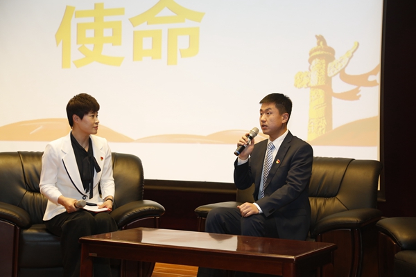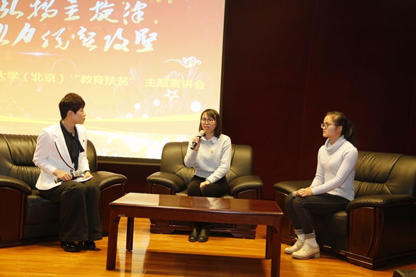 在现场,主持人李俊还分别对我校第一届国家专项计划录取的都安籍学生、现为研一的邓丽梅同学和我校教师“一对一”资助的都安籍学生、现就读于中央民族大学的大一学生蒙婷进行了访谈。“国家要在2020年实现全面小康,矿大承担了定点扶贫都安的任务,矿大为都安默默地做了这么多事,我为之深深感动。尤其让人赞赏的是,矿大人勇于做实事,真心为都安的发展着想,深入调研当地的难处,尽心尽力,尽学校所能,全校扶贫,极大地促进扶贫工作。扶贫不只是一句口号,我看到了国家的决心,矿大的决心,我们坚信都安未来无比美好。”蒙婷发自内心的话语引发了师生的热烈掌声。