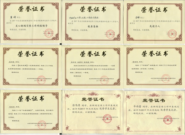 中国矿业大学(北京)党委副书记、纪委书记董晞被评为“关心新闻宣传工作的校领导”,中国矿业大学(北京)大学生记者团被评为“优秀集体”,中国矿业大学(北京)党委宣传部李静被评为“先进个人”,中国矿业大学(北京)牛雨蕾、张鸣原同学被评为“优秀学生记者”。选送作品《如果百万人之中我们的血液注定相融——记我校造血干细胞捐献者邢伟国》(作者:张鸣原、张羽玄、赵紫含)荣获2016年度北京高校新闻奖通讯类一等奖,《校友故事:一定要找到你》(作者:姚利梅)荣获2016年度北京高校新闻奖微博微信新闻类一等奖,《一句“兴奋剂骗子”,让我们愤怒,更引我们深思》(作者:况昕然)荣获2016年度北京高校新闻奖新闻网评论类三等奖,《“中国梦”的软实力》(作者:曾祥明)荣获2016年度北京高校新闻奖言论类三等奖。