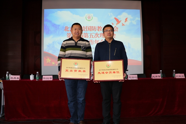 本网讯 1月18日,北京高校国防教育协会第五届第五次理事会暨工作年会在清华大学召开。会议总结了2017年工作,并对2018年北京高校国防教育工作进行了部署,对先进单位进行了表彰。北京市教委体卫艺处调研员张兵出席了此次会议。武装部部长安宇、国防教育科科长张玉琪参加会议。会上,我校荣获2017年度北京高校国防教育工作先进会员单位和2017年度北京高校国防教育工作突出贡献奖。