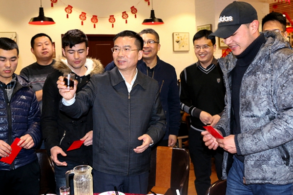 王忠强向每桌同学举杯贺岁,并为每位学生发放了“压岁红包”和亲情电话卡,嘱托同学们要多与家人联系,向亲戚朋友拜年问好,同时在校注意安全,有困难要及时和学校老师联系。