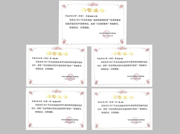 化环学院环境2016-2班在2017年北京高校“我的班级我的家”优秀班集体创建评选活动中成绩突出,荣获北京高校“示范班集体”称号;机电学院学一楼306、管理学院学八楼403、理学院学五楼503、文法学院学八楼209四个宿舍获得“北京高校示范学生基层组织(宿舍)”荣誉称号。