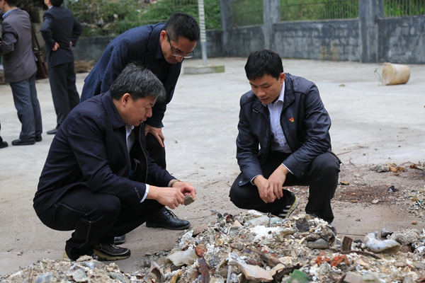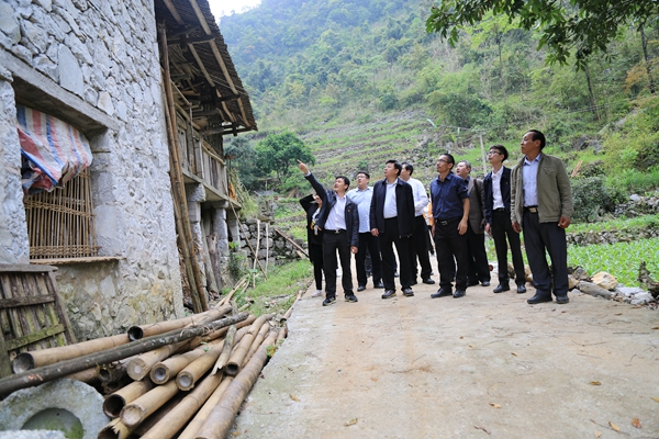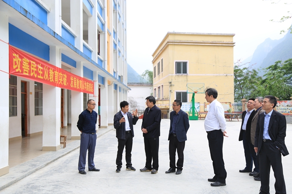 本网讯 4月11日,校长杨仁树、副校长王家臣在都安县委常委、宣传部长、副县长梁锋,我校挂职干部、都安县委常委、副县长王庆多陪同下,到广西都安县龙湾乡开展精准扶贫调研工作。