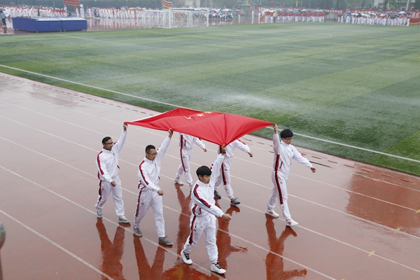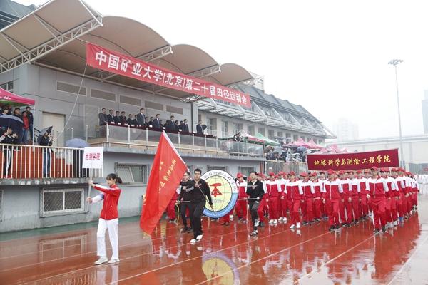 朱书全宣布运动会开幕。在国旗护卫队的护送下,五星红旗庄严入场。裁判员代表队、各学院学生运动员代表队和各单位教职工运动员代表队昂首阔步,依次经过主席台,雨水没有影响大家的热情,各代表队以良好的精神面貌展示了矿大人的风采。随后,升旗仪式举行,冉冉升起的五星红旗激发了全校师生员工的爱国爱校情怀。最后,裁判员代表和运动员代表举起右拳庄严宣誓。