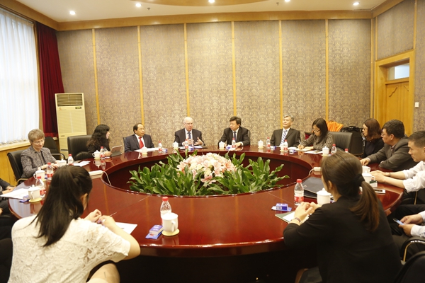 本网讯 5月21日下午,英国利兹大学校长Alan Langlands爵士携该校副校长Hai-Sui YU教授、教育、社科及法律学院副院长Norma Martin Clement教授、环境学院副院长Bill Murphy博士、国际处处长Jacqui Brown女士、国际处市场部主任Julia Wang女士、校际项目主管Lulu Pan女士、项目专员李晓晨女士来我校访问。校长杨仁树会见了代表团,参加会谈的还有副校长朱书全,化环学院、力建学院、文法学院以及国际合作与交流处相关人员。
