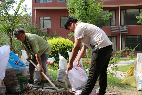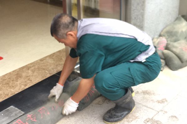 未雨绸缪,各楼宇大门口设置防汛沙袋。