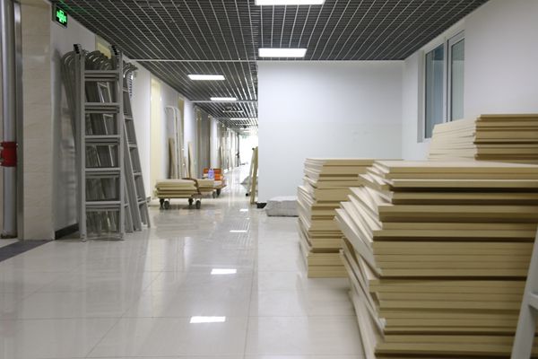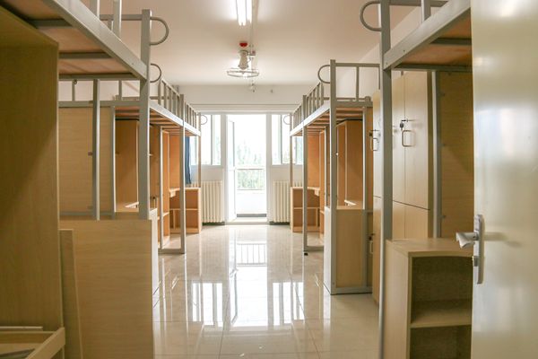 工人正在组装床柜,窗明几净的新生寝室就只待新生入住!