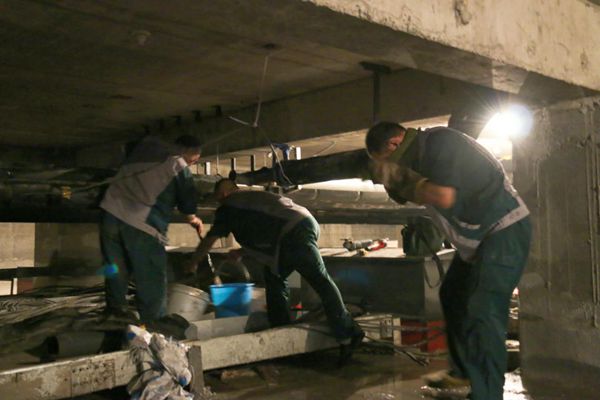 工人师傅正在进行5、6、7号学生公寓夹层消防水管破损处的焊接和更换。