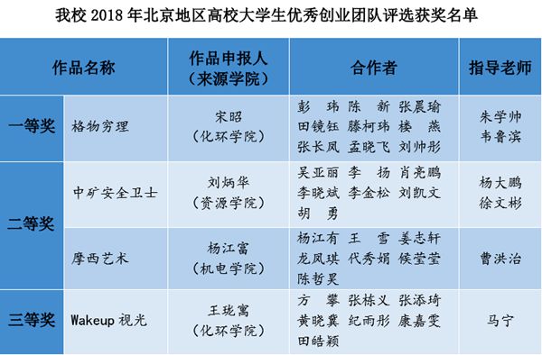本网讯 日前,北京市教委公布了2018年北京地区高校大学生优秀创业团队评选结果,我校在本届大赛中喜获佳绩:4支大学生创业团队获奖,其中格物穷理团队荣获一等奖,中矿安全卫士团队、摩西艺术团队荣获二等奖,wakeup视光团队荣获三等奖。部分获奖团队将入驻北京高校大学生创业园进行孵化。学校荣获“优秀组织奖”。
