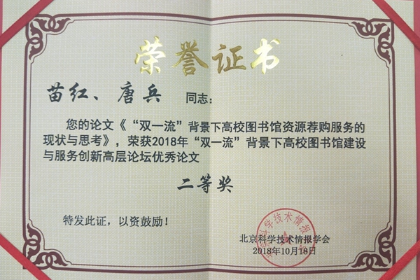 本网讯 10月18日,“双一流”背景下高校图书馆建设与服务创新高层论坛在北京林业大学举行。本次论坛由北京科技情报学会主办,北京林业大学图书馆精心承办。来自北京地区的28所高校和科研机构的181名图书情报学科专家、学者和图书馆馆员参加了本次论坛。我校图书馆副馆长杨静雯发表了《“双一流”背景下高校图书馆智慧学习空间建设研究》的学术演讲,与同行们分享了我校沙河校区智慧学习空间建设优秀案例。我校图书馆馆员苗红提交的会议论文《“双一流”背景下高校图书馆资源荐购服务的现状与思考》荣获优秀论文二等奖。
