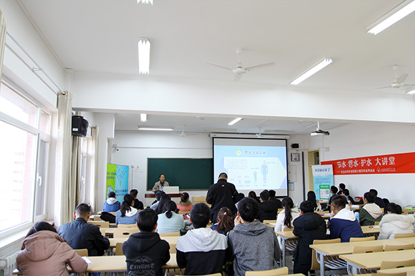 活动特邀中国建筑节能协会专家、高级工程师王海东老师作专题报告。王海东通过将国际人均用水量、我国人均用水量、北京市人均用水量进行对比,对北京市目前的蓄水和用水状况、南水北调项目情况进行了详细介绍,并针对如何合理用水、节约用水进行了指导培训。王老师呼吁大家从点滴做起,节约用水,合理用水,让每一滴水都能物尽其用。活动现场同学们还填写了“大学生节水调查问卷”,进一步巩固了节水知识。