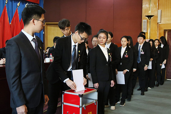 闭幕式结束后,第一届常任代表委员会第一次全体会议召开。会议通过无记名投票选举的方式,选举产生了于超等10人组成的中国矿业大学(北京)新一届学生会主席团,选举地测学院2016级本科生于超成为新一届学生会主席。