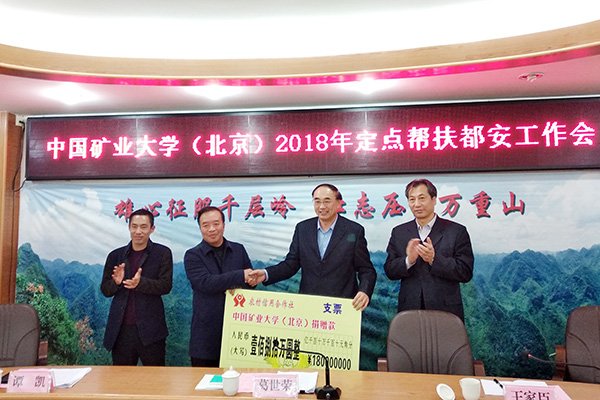 党委组织部积极选派挂职干部并关注干部成长,校工会组织教工捐款、一对一资助贫困学生15名、购买都安农特产品作为工会慰问品,教务处通过国家专项计划录取都安籍考生4人,校团委组织开展“三下乡”暑期社会实践活动和学生捐物活动,学工处、校团委选送楼燕等6人赴都安职业教育中心支教,北京矿大文化交流中心在超市设立销售都安农特产品专区,采购和帮助销售都安农特产品。在全校师生的共同努力下,学校2018年定点扶贫工作取得阶段性成果。