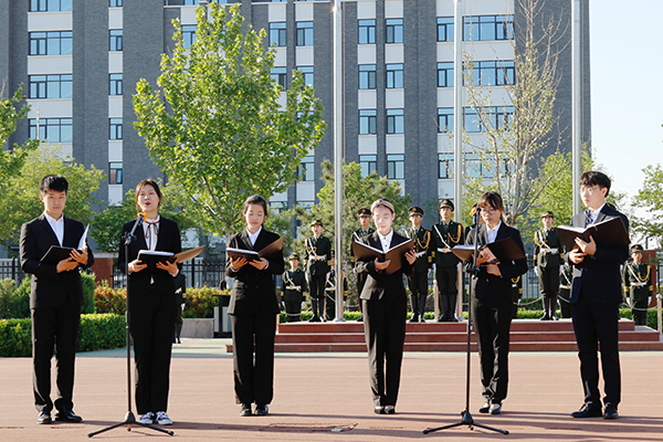 上午7时,伴着大学生艺术团乐器团庄重的奏乐声,升旗仪式正式开始。国旗护卫队步伐铿锵有力,动作整齐划一,护送国旗、校旗入场。手持小国旗的全体人员齐唱国歌,神情庄严,行注目礼,目视国旗冉冉升起。在合唱团同学的领唱下,全体同学齐唱校歌,“太行之阳河水东,莘莘学子救国重劳工……”,嘹亮的歌声围绕着校旗,每一句歌词都那么振奋人心。