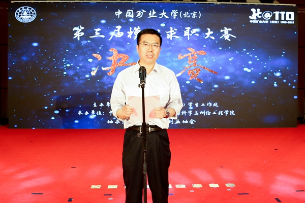 王忠强对莅临大赛的嘉宾表示热烈欢迎,向晋级决赛的同学表示衷心祝贺。他指出,我校始终围绕“立德树人”这一根本任务,深入贯彻落实党的十九大精神以及习近平总书记在全国教育大会上的重要讲话精神,科学谋划,主动作为,完善创新人才培养工作模式,在科研、教学、管理、思想教育等方面,不断丰富育人载体,创新育人方式,推动毕业生实现高质量充分就业。2019年,全国高校毕业生总量再创新高,达到834万人,毕业生就业形势依旧复杂严峻,同学们应通过锻炼全面提升综合素质和就业竞争力,实现青春梦、矿大梦。王忠强鼓励参赛选手赛出风采、取得佳绩。