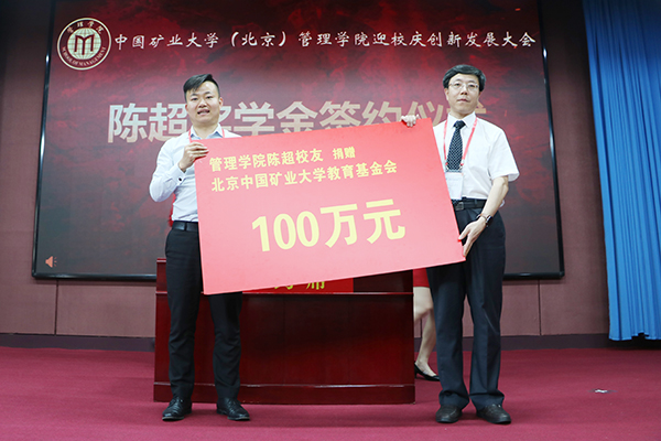 赵峰华代表北京矿大教育基金会与陈超校友签署了捐赠协议,并向陈超颁发了捐赠证书。签约仪式后,赵峰华代表全校师生向陈超捐资助学表示衷心感谢,他指出陈超奖学金的设立体现了我校校友重视教育的精神和关心母校的情怀,对于助力学生成长成才、建设优良教风学风、推动学校国际交流等具有重要意义。他要求教育基金会和管理学院要切实做好奖学金评选和捐赠款项使用,激励更多同学勤奋学习,刻苦钻研,培养学生勇于担当和甘于奉献的精神、感恩社会的道德情怀。
