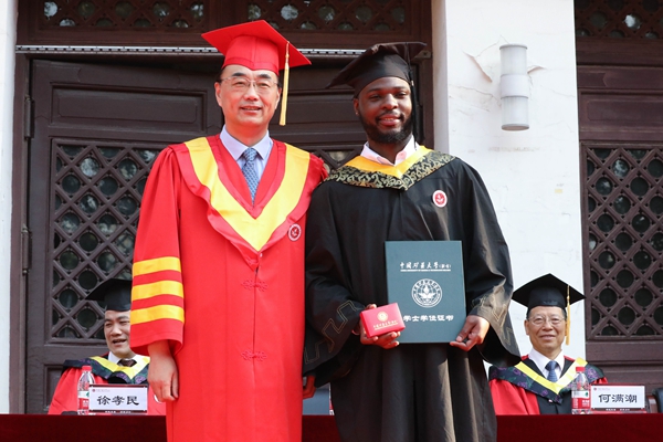 在欢快的乐曲声中,校领导、院士为全体博士毕业生拨穗正冠,授予学位证书。葛世荣为来自安哥拉的弗莱德同学授予工学学士学位。