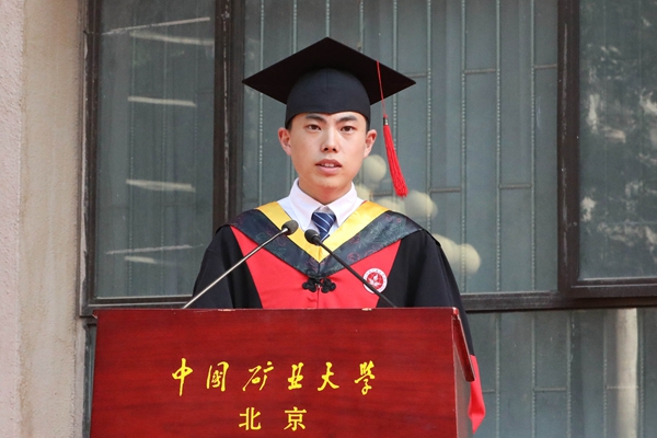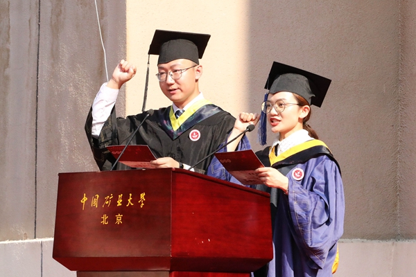 毕业生代表王典典、王治同学带领全体毕业生庄严宣誓:铭记师长教诲,弘扬矿大精神;崇尚科学,追求真理,艰苦奋斗,勇于创新;迎难而上,不断进取,奉献社会,服务人民;肩负起时代赋予的光荣使命,为祖国的富强不辞劳苦,为民族的复兴奋斗终生!