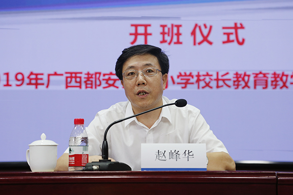 赵峰华指出,习近平总书记在全国教育大会上明确提出教育是“国之大计,党之大计”;高素质的教师队伍是办好教育的根本和基础;中小学校长在基础教育师资队伍建设中发挥着极其重要的作用,是第一责任人。本次培训也是我校智力帮扶、精准扶贫的重要举措,学校党委和行政对此高度重视,特别与我国中小学教师培训领域具有重要地位的教育部直属高等教育出版社教师发展中心合作,精心部署和安排培训内容。该中心在教育理念、教育平台、教育手段、专家资源等方面都具有独特优势,相信将为大家带来收获。本次培训涉及教育教学方法、领导力、德育教育等多个方面,知识涵盖面广,有较强的针对性和指导性。希望各位学员从思想上高度重视,珍惜学习机会,学有所得、学有所获、学有所用,为都安县基础教育事业再上新台阶和推动都安县发展做出新的更大贡献。
