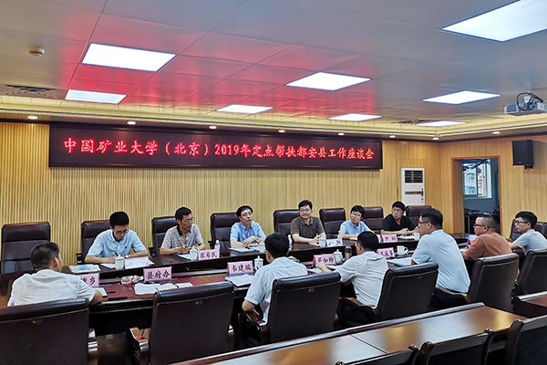 7月24日,我校扶贫工作组在都安县政府会议室主持召开了中国矿业大学(北京)2019年定点帮扶都安县工作座谈会。都安县委副书记、县长蓝如帅,县委常委、组织部部长韦建端,我校挂职干部、县委常委、副县长王庆多,都安县政府办、扶贫办、龙湾乡等有关部门负责同志,我校选派的驻村第一书记谢均岩和栾利建,以及我校扶贫工作组成员参加会议。