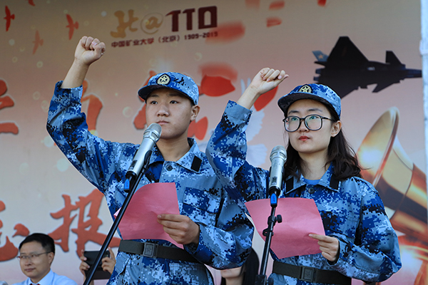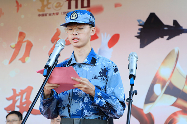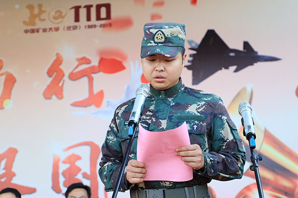 地测学院学生曹泽远代表全体参训学生发言。他表示会以健康的体魄、坚韧的意志、集体主义的精神迎接军训的到来,以军人情怀、军人的姿态去践行青春的誓言,体验生命的精彩,用此种最诚挚的方式为祖国70华诞、矿大110周年校庆献上自己的祝福。