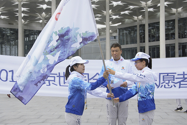 我校志愿者孙彤接过世园会志愿者旗帜