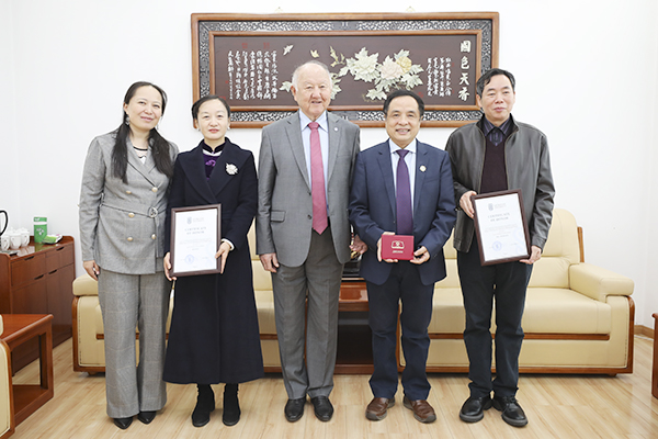 哈萨克斯坦萨特帕耶夫大学授予我校彭苏萍、戴华阳和毕银丽国际教育合作奖