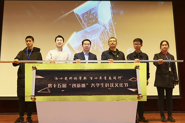 王忠强、学生工作处处长安宇、校团委书记孙铭晗、校团委副书记谢均岩、大学生科学技术协会主席曾杨同学和2019级新生代表邹沂珊同学上台共同启动2019年科技文化节。