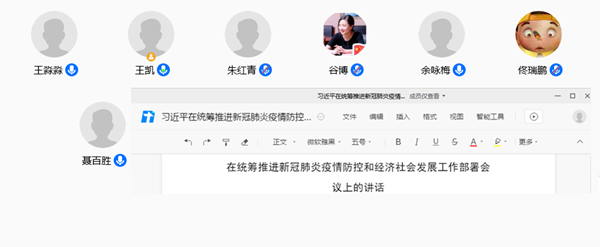 与会人员认真学习了《习近平在统筹推进新冠肺炎疫情防控和经济社会发展工作部署会议上的讲话》并进行讨论,纷纷表示通过学习习近平总书记讲话精神,看到了中华民族不畏艰难的大国风范,坚定了疫情防控必胜的信念,坚信在党的正确领导下,全国人民万众一心,必定能打赢这场疫情防控阻击战,我国的经济社会发展也将很快重新步入正轨。